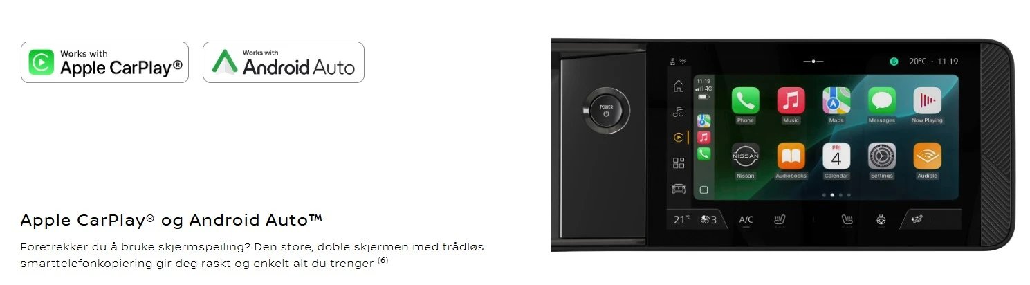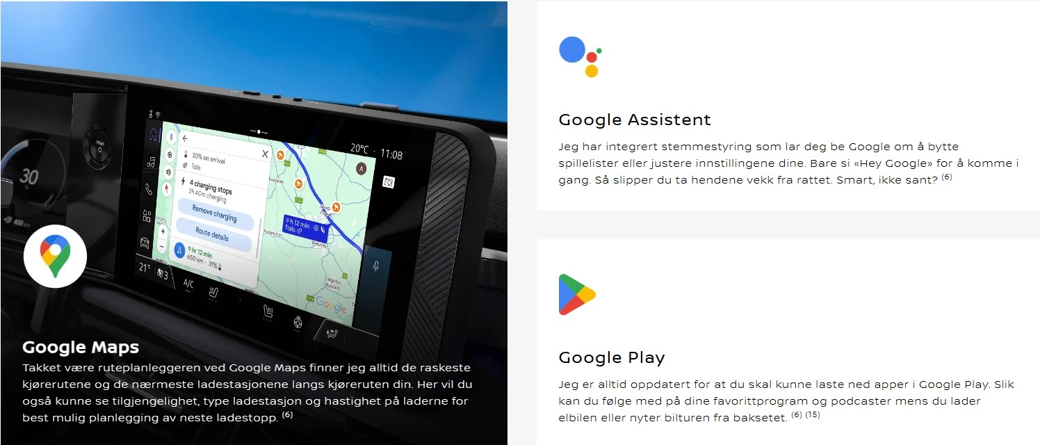 Jepp, jeg er utstyrt med smarte Google-funksjoner!Dette sikrer at du holder deg fullstendig tilkoblet, selv når du er underveis. Du kan nyte håndfri betjening, kartvisning som er enkel å forstå samt tilgang til mobilappene dine. Slik kan du fokusere på det aller viktigste - nemlig kjøreturen. (6) . |