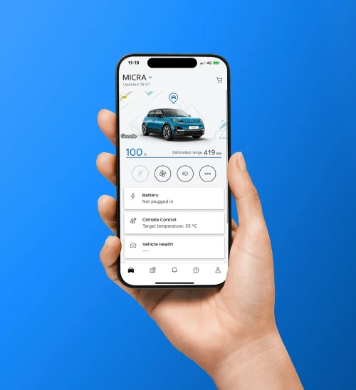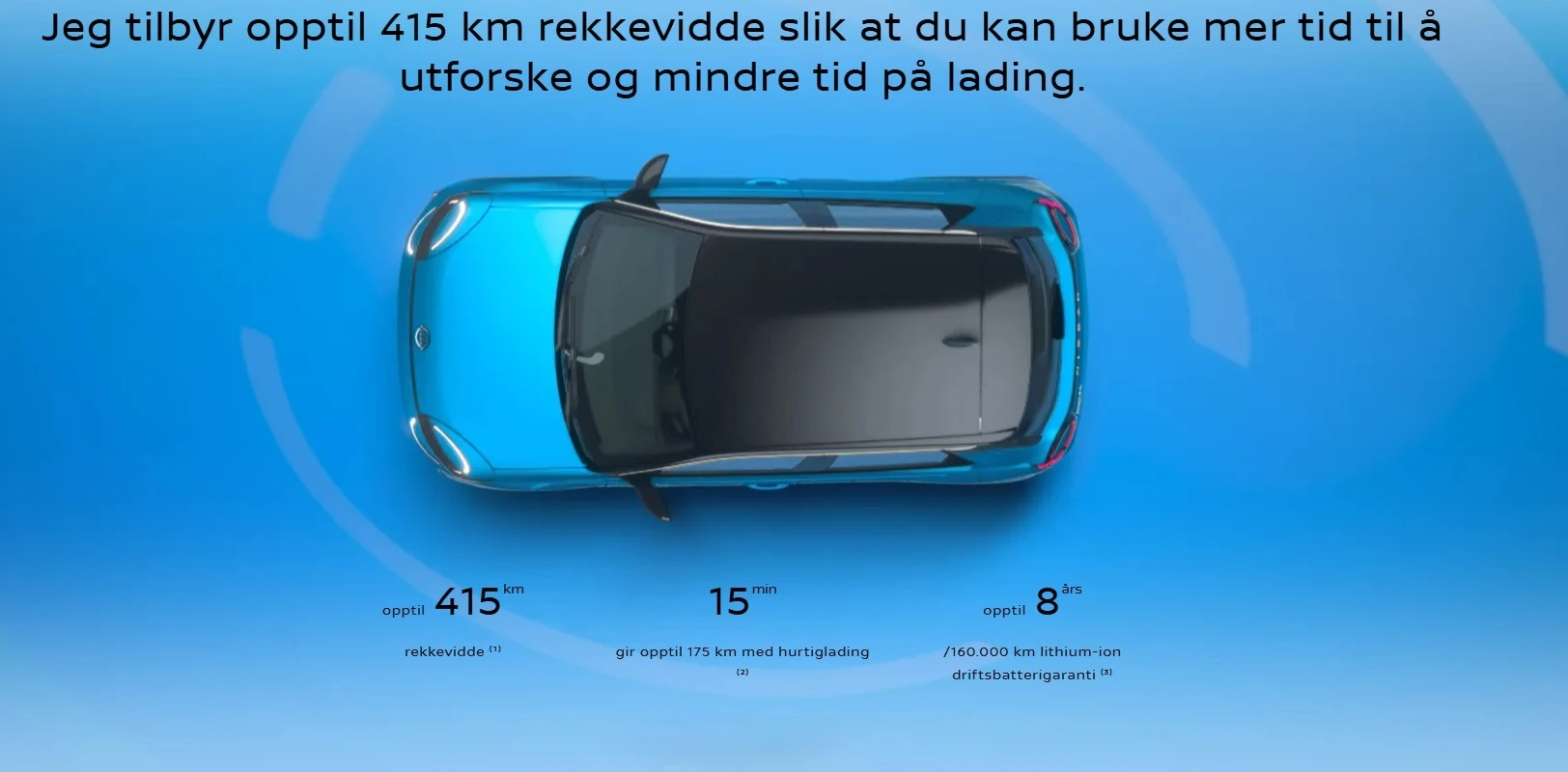 (1) Merk at den oppgitte rekkevidden som vises er veiledende og refererer til MICRA 52 kWt (merk også at endelig rekkevidde er i påvente av homologering/typegodkjenning). Rekkevidden påvirkes av type utstyrsversjon, batteripakke og drivlinjekombinasjon. Tallene for rekkevidde er hentet fra laboratorietester utført i henhold til EUs regelverk og er beregnet for sammenligning av ulike typer kjøretøy. Rekkeviddetall gjenspeiler ikke nødvendigvis faktiske kjøreresultater. Valgfritt tilleggsutstyr, vedlikehold, kjørestil og ikke-tekniske faktorer slik som værforhold kan påvirke de offisielle resultatene. Tallene ble bestemt ved bruk av testprosedyren Worldwide Harmonized Light Vehicles Test Procedure (WLTP). (2) Oppnåelse av opptil 175 km rekkevidde i løpet av 15 minutter refererer til lading med 80KW & 100KW DC ladehastighet på MICRA med 52 kWt. Merk at ladehastighet ladetid kan variere da disse kan påvirkes av flere faktorer slik som; ladeforhold, temperatur og tilstand på batteri, hvor mange andre som lader på samme ladestasjon samtidig som deg, omgivelsestemperatur ved bruk, og om batterisikringsteknologi er aktivert. I kaldt klima kan bruk av forvarming av batteriet være nødvendig for å kunne forbedre hastigheten ved hurtiglading. (3) Lithium-ion drfiftsbatterigaranti: Denne drfiftsbatterigaranti for lithium-ion batteriet på nye MICRA beskytter elbilen din og gjelder for opptil 8 års/160.000 km alt ettersom hva som inntreffer først. (5) Merk at utvalget av tilgjengelige funksjoner kan variere da dette er avhengig av type utstyrsversjon og hva som er standard- eller ekstrautstyr (mot pristilegg) på denne. (6) Google, Google Play og Google Maps er varemerker av Google LLC. (7) Merk at den oppgitte rekkevidden som vises er veiledende. 316 km rekkevidde henviser til MICRA 40kWt og 415 km rekkevidde henviser til MICRA 52kWt (merk også at endelig rekkevidder er i påvente av homologering/typegodkjenning). Rekkevidden påvirkes av type utstyrsversjon, batteripakke og drivlinjekombinasjon. Tallene for rekkevidde er hentet fra laboratorietester utført i henhold til EUs regelverk og er beregnet for sammenligning av ulike typer kjøretøy. Rekkeviddetall gjenspeiler ikke nødvendigvis faktiske kjøreresultater. Valgfritt tilleggsutstyr, vedlikehold, kjørestil og ikke-tekniske faktorer slik som værforhold kan påvirke de offisielle resultatene. Tallene ble bestemt ved bruk av testprosedyren Worldwide Harmonized Light Vehicles Test Procedure (WLTP). (8) Oppgitte rekkeviddetall gjelder for batteristørrelsene 40kWt og 52kWt med 80KW & 100KW DC-lader. Merk at ladehastighet ladetid kan variere da disse kan påvirkes av flere faktorer slik som; ladeforhold, temperatur og tilstand på batteri, hvor mange andre som lader på samme ladestasjon samtidig som deg, omgivelsestemperatur ved bruk, og om batterisikringsteknologi er aktivert. I kaldt klima kan bruk av forvarming av batteriet være nødvendig for å kunne forbedre hastigheten ved hurtiglading. (9) Oppgitte rekkeviddetall gjelder for batteristørrelsene 40kWt og 52kWt med 11kW AC-hjemmelading fra 10 % til 100 %. Merk at ladehastighet ladetid kan variere da disse kan påvirkes av flere faktorer slik som; ladeforhold, temperatur og tilstand på batteri, omgivelsestemperatur ved bruk, og om batterisikringsteknologi er aktivert. I kaldt klima kan bruk av forvarming av batteriet være nødvendig for å kunne forbedre hastigheten ved hjemmelading. (10) Oppgitte rekkeviddetall gjelder for batteristørrelsene 40kWt med 50kW DC-hurtiglading. Merk at ladehastighet ladetid kan variere da disse kan påvirkes av flere faktorer slik som; ladeforhold, temperatur og tilstand på batteri, hvor mange andre som lader på samme ladestasjon samtidig som deg, omgivelsestemperatur ved bruk, og om batterisikringsteknologi er aktivert. I kaldt klima kan bruk av forvarming av batteriet være nødvendig for å kunne forbedre hastigheten ved hurtiglading. (11) Oppgitte rekkeviddetall gjelder for batteristørrelsene 40kWt og 52kWt med 80KW & 100KW DC hurtiglader. (12) Rekkeviddegjenoppretting opptil 175 km på 15 minutter refererer til bruk av 80KW & 100KW DC-hurtiglading på MICRA med batteristørrelsen 52kWt. Merk at ladehastighet ladetid kan variere da disse kan påvirkes av flere faktorer slik som; ladeforhold, temperatur og tilstand på batteri, hvor mange andre som lader på samme ladestasjon samtidig som deg, omgivelsestemperatur ved bruk, og om batterisikringsteknologi er aktivert. I kaldt klima kan bruk av forvarming av batteriet være nødvendig for å kunne forbedre hastigheten ved hurtiglading. (13) Oppgitte rekkeviddetall gjelder for batteristørrelsen 52kWt med 50kW DC-hurtiglading fra 15 % til 80 %. Merk at ladehastighet ladetid kan variere da disse kan påvirkes av flere faktorer slik som; ladeforhold, temperatur og tilstand på batteri, hvor mange andre som lader på samme ladestasjon samtidig som deg, omgivelsestemperatur ved bruk, og om batterisikringsteknologi er aktivert. I kaldt klima kan bruk av forvarming av batteriet være nødvendig for å kunne forbedre hastigheten ved hurtiglading. (14) For å kunne benytte deg av våre NissanConnect Services-tjenester trenger du en smarttelefon med kompatibelt iOS- eller Android-operativsystem og et SIM-kort med datapakke fra en mobilabonnementleverandør. Du kan når som helst laste ned vår gratis NissanConnect Services-app og opprett en bruker med brukernavn og passord. Når du har gjort dette kan du koble sammen smarttelefonen din med bilen din så frem den er kompatibel med appen. Dette gjør du ved å logge deg inn med brukeren din med tilhørende brukernavn og passord. Alle våre NissanConnect Services-tjenester er avhengig av mobilnett/dekning for å kunne fungere. Hvis du har fått tilgang til NissanConnect Services-tjenester gjennom et bestemt tilbudet kan disse være gratis i en bestemt tidsperiode avhengig av tilgjengelighet, bilmodell, årsmodell og utstyrsversjon. Noen av tje